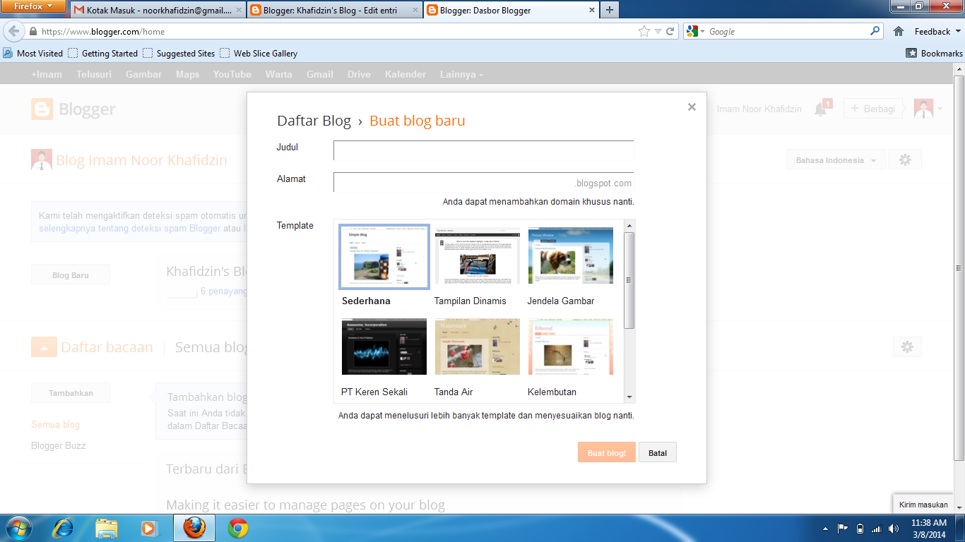 setelah login, klik buat Blog, kemudian Anda disuruh untuk mengisi Judul Blog pada kolom Judul, Lalu Alamat Blog, misal noorkhafidzin**.blogspot.com,** dan pilihlah desain Template yang Anda inginkan, yaitu desain untuk mempercantik blog.