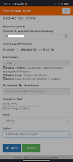 4. Silahkan klik “Daftar”, pastikan Data Sosial sudah benar dan isikan di Data Admisi Online “jenis asuransi, asal rujukan, no rujukan, tanggal berobat, klinik, hingga dokter” Lalu klik “Daftar”.