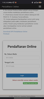 3. Anggap sudah punya No. RM. Masukkan No. RM dan tanggal lahir klik login, jika data benar maka akan muncul tampilan seprti ini.