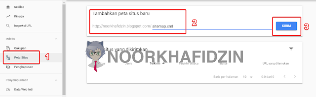 Buka halaman Search Console dan pilih menu Peta Situs (Sitemap). Kemudian pada Tambah peta situs baru (Add a new sitemap), isi dengan teks berikut ini dan klik tombol SUBMIT atau KIRIM.